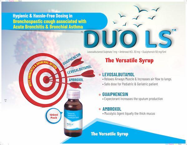 Duo LS Syrup is a dual ventilator with Levosalbutamol Sulphate and Guaiphensin for relaxing airways muscle and increasing air flow. Safe for pediatric and geriatric patients.
