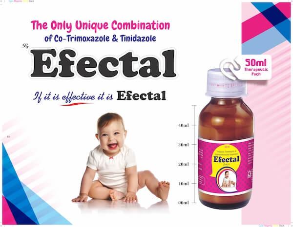 For mixed diarrhoeal infection. Efectal Suspension is a unique combination of Co-Trimoxazole and Tinidazole for an effective solution. Comes in a 50 ml therapeutic pack.